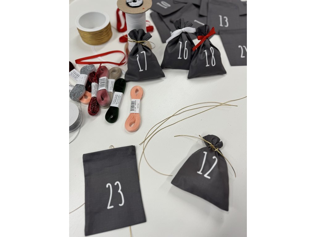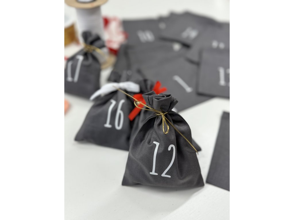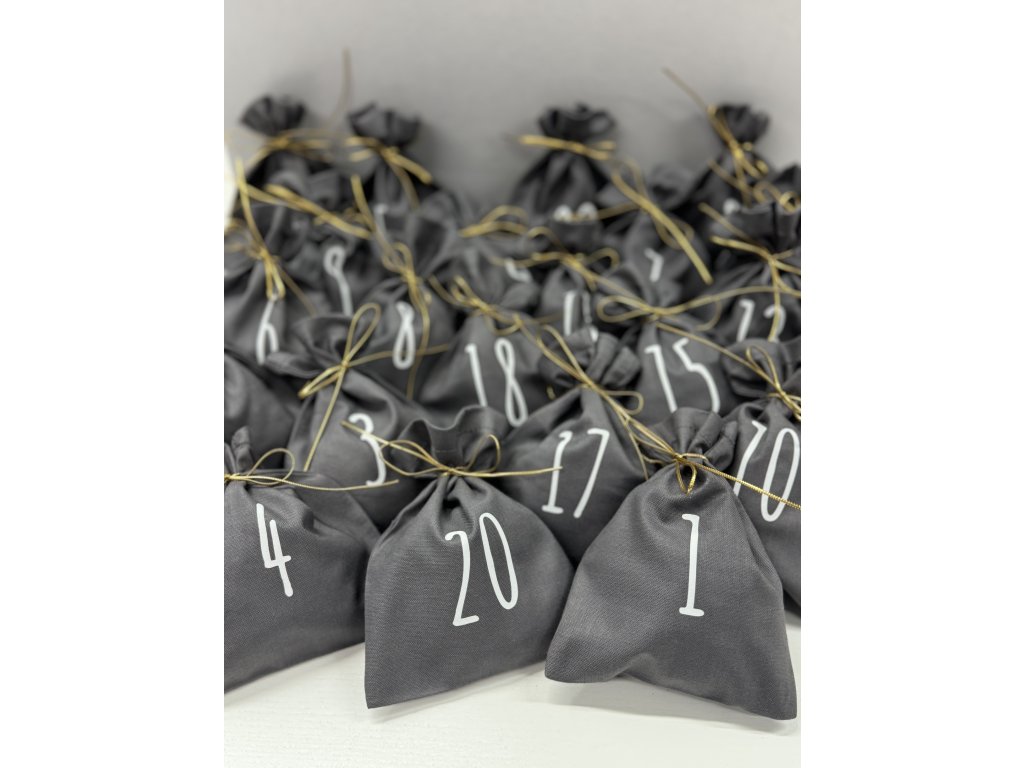 Adventní kalendář šedý - 24 pytlíčků s číslicemi na zavázání