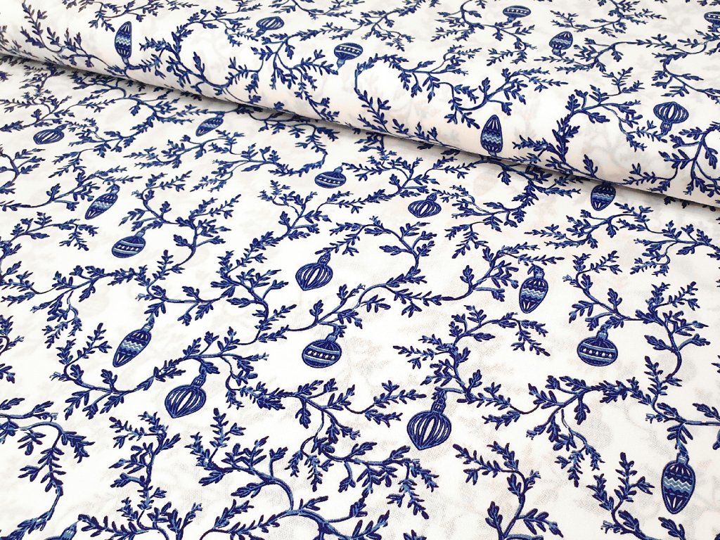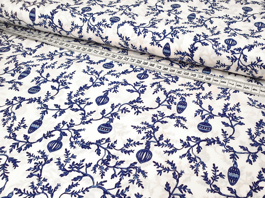 Bavlněné plátno vánoční - modré větvičky a ozdoby na bílé