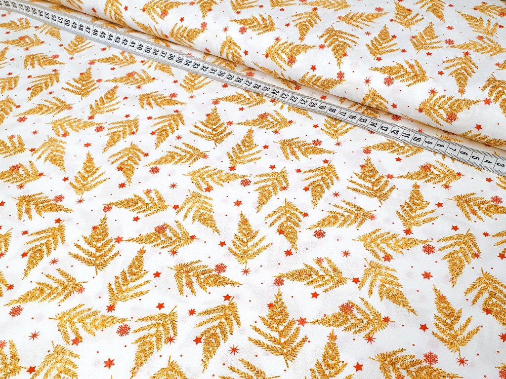 Bavlněné plátno - zlaté jehličí a červené hvězdy na bílé